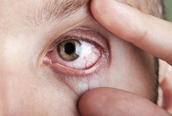 - При исследовании врачом офтальмологом часто обнаруживается повышение внутриглазного давления. При внешнем осмотре склера глаза инъецирована, прикорнеальные инъекции приобретают красно-фиолетовый оттенок.